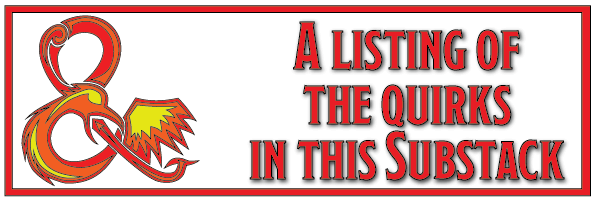 Since we’re going to be using a lot of a material designed to work with D&D 5E here, I need to address a problem on how I can present this in Substack. Substack is meant for e-mail lists, and its on-site editor is geared for that purpose. That means no tables, type variety is limited, you have to use image files for fancy text, and a lot of other items that just won’t fit. And then there’s the restriction Google Mail imposes which I’ll be flat out ignoring.